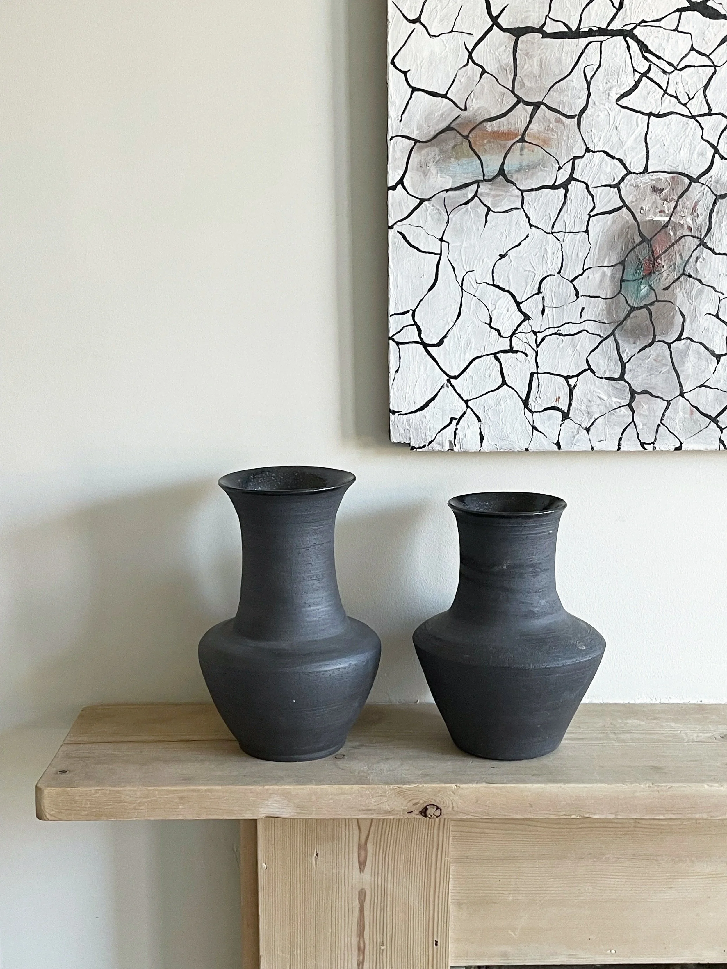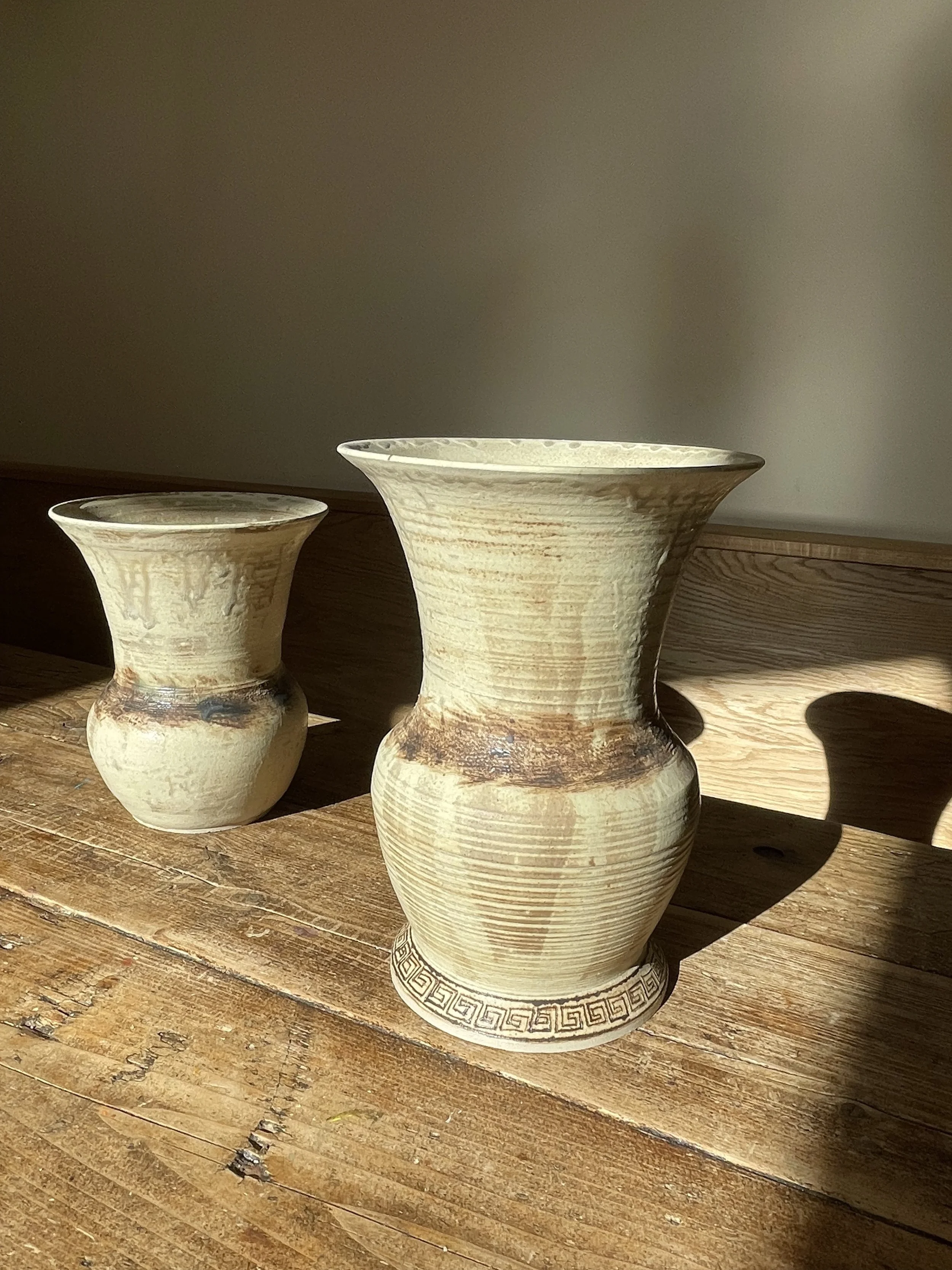 The vases in this collection are all thrown in two pieces and joined at leather-hard stage to create larger more expressive forms. With some pieces the join is highlighted with oxide to celebrate the union, while others are blended together such that the piece has always been one.